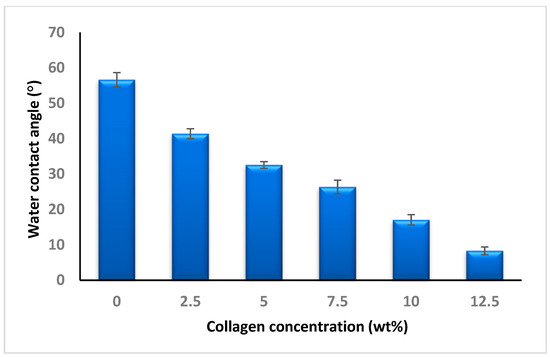 | PLLA/collagen nanofibers | The incorporation of collagen to the PLLA biopolymer nanofibers to improve the surface wettability resulted in a water contact angle of 80° for the development of bone graft. | [27] |