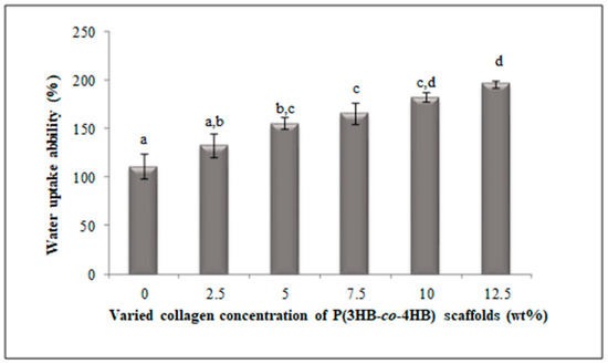 | P(3HB-co-4HB) + 10 wt% collagen | 83 ± 2 a,b |