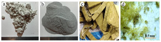 Photographs showing the materials: (a) geopolymer Baucis lk, (b) aluminum powders, (c) basalt fibers before grinding, and (d) basalt fibers after grinding.