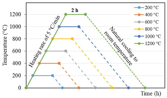To assess the properties of the BGFs at elevated temperatures, samples were exposed to elevated temperatures at 200, 400, 600, 800, 1000, and 1200 °C. The BGF specimens were heated in a furnace at a heating rate of 5 °C/min until the desired temperatures and were kept at each temperature in the furnace for 2 h. The heated BGF samples were then naturally cooled down to RT in the furnace. The heat treatment process of the BGF samples is presented in Figure 2.
