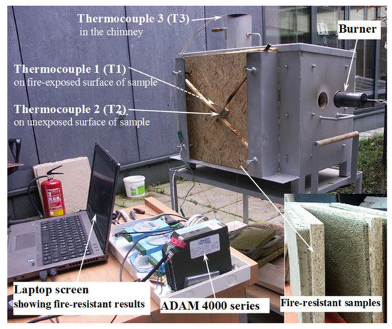 The inside, outside and chimney temperatures of the fire test furnace were measured using in-built thermocouples connected to the computer by ADAM 4000 series. The respective thermocouples T1, T2, and T3 were mounted on the fire-exposed surface of the specimen, unexposed sample surface, and in the furnace chimney. The fire test furnace, position of thermocouples, the ADAM 4000 series system, laptop, and others were depicted in Figure 3.