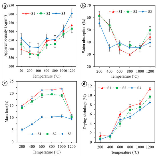 The water absorptions of the BGFs are presented in Figure 4b. As Figure 4b shows, the highest water absorptions of the S1, S2, and S3 occurred at 200 °C were 62.3%, 61.5%, and 55.4%, respectively. The water absorption of the S1 decreases drastically with increasing the temperature from 200 to 800 °C, then gradually increased as the temperature rises to 1200 °C. Similarly, the water absorption of the S2 dropped rapidly with the increase of the temperature from 200 to 600 °C, next changed moderately to 1000 °C, and finally increased sharply to about 50% at 1200 °C. The water absorption of the sample S3 fell remarkably as the temperature rose to 400 °C and then fluctuates at around 35% beyond 400 °C. It is interesting that the S1, S2, and S3 showed the similar water absorption at a temperature of 1000 °C. Particularly, the water absorption of the sample S3 with higher basalt fiber content was lower than that of samples S1 and S2 at temperatures of below 600 °C and above 1000 °C.