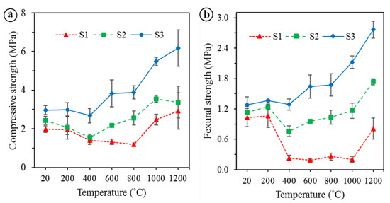 The compressive and flexural strengths of the BGFs are presented in Figure 5. As observed in Figure 5a, the compressive strength of the BGFs changed somewhat at temperatures below 200 °C and then decreased slightly in the temperature range from 200 to 400 °C. Once the temperature increased from 400 to 800 °C, the S1 showed a slight reduction in the compressive strength, while the S2 indicated an enhancement in the compressive strength. Unlike the S1 and S2, the S3 showed that the compressive strength increased with increasing the temperature to 600 °C and then remained constant between 600 and 800 °C. The compressive strengths of the S1, S2, and S3 enhance with the rise of the temperature from 800 to 1000 °C. As the temperature increased from 1000 to 1200 °C, the S1 and S3 showed an increase in the compressive strength, whereas the S2 indicates an inconsiderable reduction. Interestingly, the compressive strength of the BGFs heat-treated at 1200 °C was improved significantly compared with that at temperatures below 200 °C. The respective samples S1, S2, and S3 after heating at 1200 °C showed an increase in the mean compressive strength by 48.0%, 39.1%, and 107.6% compared to those at RT. In addition, the compressive strength enhanced with raising the basalt fiber content.