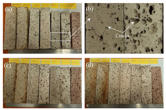 It is interesting that the compressive and flexural strengths of the BGF with highest fiber content (S3) were improved considerably at high temperatures over 600 °C. Unlike the S3, the S1 with low fiber loading showed a decrease in its compressive and flexural strengths at temperatures below 1000 °C. This reduction is attributable to macroscopic cracks appeared in samples (Figure 6b). However, the cracks did not appear in the BGF samples with the high fiber content (Figure 6c,d). The strength increase of the S3 was due to reinforcing the basalt fibers in the metakaolin-based geopolymer, because basalt fibers showed a good strength and stiffness at high temperatures [41]. In addition, all three samples indicate a great enhancement in the compressive and flexural strengths as the temperature rose from 1000 to 1200 °C. The improvement in the mechanical strengths of the BGFs at high temperatures is ascribable to their structural changes, including sintering, densification, melting, and porosity [4].