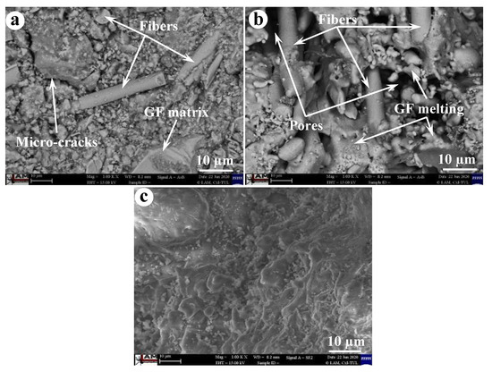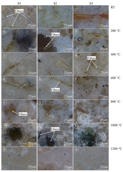 The occurrence of sintering, densification and melting makes decolorization in geopolymer mortars when the temperature over 1000 °C [32]. Figure 7 showed the decolorization and fiber appearance of the BGF samples when heating them at high temperatures. As observed in Figure 7, the BGF samples have a similar color at temperatures below 200 °C. The color of the BGF samples changed slightly in the temperature range from 400 to 1000 °C. The BGF sample at 1200 °C looked brighter than the others at lower temperatures. In addition, basalt fibers are visible at temperatures below 1000 °C and were not observed at 1200 °C. Ye et al. [32] reported that the increase in the compressive and flexural strengths of geopolymer mortars is attributable to melting and densification effects after heating at 1000 °C. In our study, the melting of potassium-based geopolymer matrix was observed after the BGFs exposed to high temperatures over 1000 °C (Figure 8b). The melting of the geopolymer matrix caused the densification of the BGFs (Figure 7u and Figure 8c) and facilitated a strength increase at 1200 °C (Figure 5).