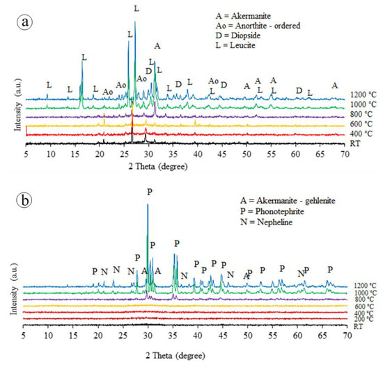 Moreover, the formation of ceramic phases in the BGFs at 1200 °C (Figure 8) enhanced, considerably, their compressive and flexural strengths (Figure 5). The phase changes of the metakaolin-based geopolymer and basalt fibers at high temperatures are depicted in Figure 9. Evidently, there was the presence of amorphous phases in the metakaolin-based geopolymer at RT [28,36,42]. The XRD patterns in Figure 9a exhibited no significant phase change in the geopolymer samples below 800 °C. However, over 1000 °C exposure the amorphous phases converted into crystalline phases due to geopolymerization mechanism, such as leucite (KAlSi2O6), akermanite (Ca2MgSi2O7), anorthite (CaAl2Si2O8), and diopside (CaMgSi2O6). These phases are stable crystalline phases and have a great stability at high temperatures. The strong peaks at 2θ angles of 27° and 30° in the geopolymer mainly identify the presence of leucite and akermanite phases at 1000 and 1200 °C. The leucite peaks at 1200 °C are higher than those at 1000 °C.
