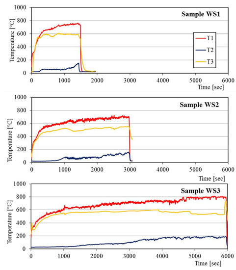 Fire resistance testing was conducted on the wood and steel plates coated by a BGF layer type S3 with different thicknesses using the flame of a gas burner. The samples of the wood boards and steel plates for fire resistance test were presented in Table 3. The temperature-time curves of the fire resistance test for the wood samples are presented in Figure 10. The fire-resistant times for the samples WS1, WS2, and WS3 were 22, 49, and 99 min, respectively. The fire-resistant time increased with increasing the thickness of coated BGF layer. The fire-resistant time of the wood sample with 20 mm thickness of coated BGF layer was 4.5 times higher than that without coating the BGF layer. The temperatures on the fire-exposed surface of all samples increased rapidly during the initial period and then enhanced slowly beyond 15 min. The temperatures on the unexposed surface of all samples raised gradually during the fire resistance testing. The non-fire surface temperatures of the wood samples did not exceed 200 °C, while the maximal temperature on their fire-exposed surface did not pass 800 °C.