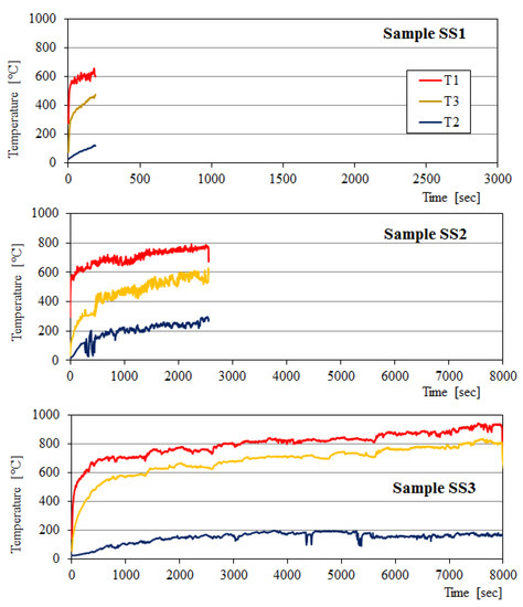 As with the wood boards, the fire resistance of the steel samples which was shown in Figure 11 depended on the thickness of the coated BGF layer. The fire-resistant time of the steel plates covered with the BGF layer was 41 min for the SS2 and 134 min for the SS3, but it was just 9 min for the SS1 (steel plate without coating) in the same testing condition. The fire-resistant time of the SS3 was about 15 times higher than that of the steel plate without coating the BGF (SS1). The maximal temperature on the fire-exposed surface of samples in the furnace did not exceed 900 °C and the unexposed surface temperatures did not surpass 300 °C. It is noted that the fire-resistant time of the wood and steel plates coated by a BGF layer depends not only on the coating thickness but also on the thermal conductivity of the substrate. With the same BGF coating thickness, the fire-resistant time of the steel sample (SS3) was 2.73 times higher than that of the wood sample (WS2).