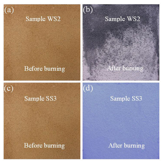 Photographs showing the fire-exposed surfaces of the samples WS2 and SS3: (a) and (c) before burning, (b) and (d) after burning.