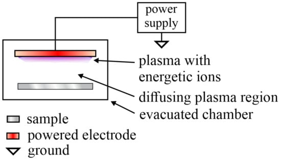 A low-pressure plasma reactor was also used for the pre-treatment of PA6 discs to increase the adhesion properties [10]. The plasma was sustained in argon at the pressure of 40 Pa. The PA6 discs were washed in an ultrasonic bath with ethanol for 10 min, then dried thoroughly at 80 °C for one day. The authors did not reveal the plasma treatment time, but the WCA dropped from 64 to 31°. The XPS showed a small increase in both oxygen and nitrogen concentrations on the surface of the plasma-treated discs, and the peel strength remained practically intact. The plasma treatment, however, was found beneficial for the adhesion of a silane coupling agent, which assured excellent joints between the PA6 and rubber discs. Namely, the peel strength increased from about 6 up to 80 N/cm. The adhesion mechanism and the reactions with the coupling agent are elaborated in [10]. The papers by Mandolfino et al. [1] and Sang et al. [10] are the only scientific documents on the application of low-pressure plasma reactors. Although the configurations vary, both groups applied the plasma reactors shown schematically in Figure 1. The energetic particles are concentrated next to the powered electrode, and the entire volume of the reactor is filled with a rather uniform diffusing plasma. The samples are placed away from the powered electrode to prevent overheating.