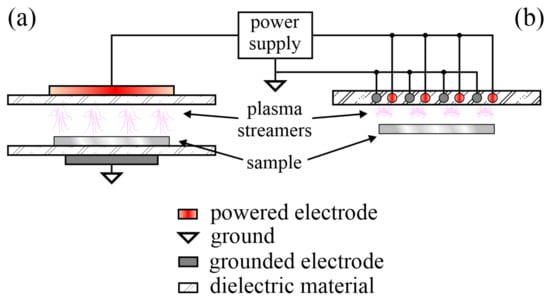 Either classical or coplanar dielectric barrier discharges (DBD) were used to treat PA materials at an atmospheric pressure. Unlike the low-pressure configuration where a rather uniform plasma occupies a large volume, as shown in Figure 1, the DBD produces temporally and spatially constrained streamers. The schematic of the experimental setups useful for the treatment of PA samples at an atmospheric pressure is shown in Figure 2. Numerous streamers (localized dense plasma of short duration) spread from the electrodes and influence the surface finish of polymer materials. The sample is placed between the electrodes (usually plane-parallel) in the classical mode, whereas in the coplanar mode the sample is above the plasma streamers.