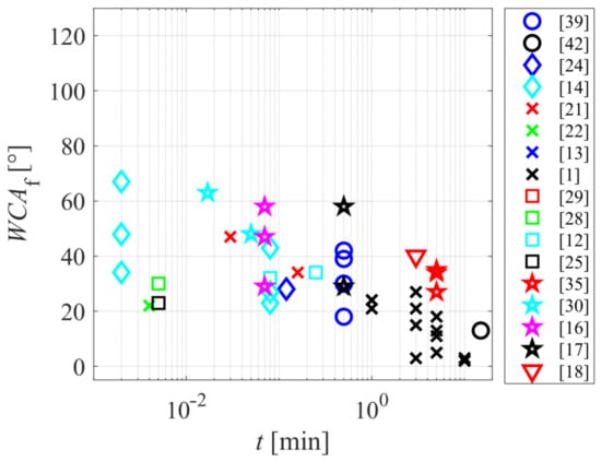 The final WCA reported by the majority of authors is between 20 and 40°. Figure 3 reveals the final WCA versus the treatment time. Despite the large scattering of the reported results, there is an evident trend—a longer treatment time results in a lower WCA and thus better wettability. The super-hydrophilic effect (WCA below a few degrees) was reported only for treatment times of several minutes. This observation is explained due to the fact that the WCA on a smooth surface cannot be extremely low, but a nanostructured surface finish is needed for the super-hydrophilic effect [8]. Nanostructuring of polymers is a result of non-homogeneous etching. The etching at a reasonable temperature (preferably close to the room temperature) is a slow process since the etching rate is often the order of nanometers per second [45,46]. The combination of rich surface morphology and high concentration of polar functional groups is usually observed only for polymers treated by low-pressure plasma [46,47]. Surprisingly, most authors concentrated their research on atmospheric-pressure plasmas, although they rarely enable a super-hydrophilic surface finish.