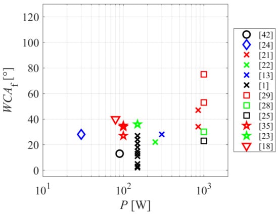 The relationship between the surface wettability and discharge power is shown in Figure 4. It seems that high discharge powers do not lead to highly wettable surfaces, but moderate powers around 100 W perform better. It should be stressed that the absolute value of the discharge power may not be the best parameter, since the processing parameters depend on numerous other parameters such as the size of the treatment device, the pressure, and many other peculiarities. A more appropriate parameter would be the power applied to the plasma and normalized to the surface area (in the case of one or two-dimensional discharges) or to the plasma volume (in the case of continuous discharges that create the homogeneous plasma in a particular volume).