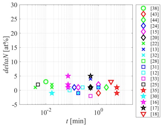 The majority of authors used XPS for monitoring the modification of surface chemistry. While the XPS survey spectra are acquired in a reasonable time, the acquisition and interpretation of high-resolution spectra may take time, therefore, most authors limited such investigations. Still, most authors represented the concentration of nitrogen, oxygen, and carbon versus the treatment parameters. Figure 5 represents the difference in N-concentration, as probed by XPS, versus the treatment time. Evidently, there is no trend, and the difference is rather small. Some authors reported enrichment in the N-concentration, but many a depletion despite using plasma sustained in the air or even “pure” nitrogen. The functionalization of polyamides with nitrogen functional groups (such as amino groups), therefore, remains a challenge. A feasible explanation for the lack of additional nitrogen on the PA surface is the preferential functionalization with oxygen. It is difficult to assure oxygen-free plasma due to the water vapor, which is likely to be present in low-pressure and atmospheric-pressure plasma reactors. Here, it should be stressed that even a 1 min concentration of water vapor in processing gas will cause the formation of OH radicals upon plasma conditions and the interaction of these radicals with the polymer surface. The effect of such water-vapor on the surface finish of a polymer upon treatment with “pure” argon was recently elaborated in [48].