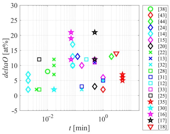 The functionalization with oxygen functional groups is a common consequence of plasma treatment of polyamides. Figure 6 represents the increase of the oxygen content, as probed by XPS, versus the treatment time. Please note the logarithmic scale on the x-axis. Figure 6 reveals that all authors reported at least an increase of 2 at%. The average increase is about 10 at%, and it seems that the treatment time is not the factor dictating the concentration of oxygen on the surface of a polyamide sample. Such a rather unexpected fact is explained by the etching of polymer samples whose surfaces have been saturated with oxygen functional groups. The final concentration of oxygen is, therefore, a compromise of surface functionalization by the chemical interaction of reactive species such as O, OH, O3, and positively charged ions, and the removal of surface functionalities by releasing CO, CO2, and more complex molecules. The etching rate increases with increasing discharge power.