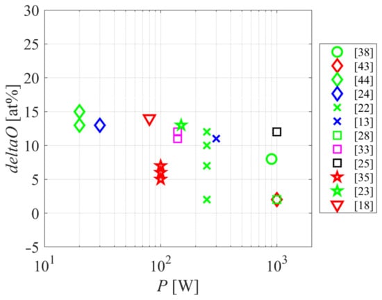 The difference in oxygen concentration as probed by XPS versus the discharge power.