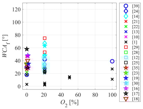 The concentration of oxygen in the original gas mixture does not seem to be a decisive factor for surface wettability. Figure 8 represents the final water contact angle versus oxygen concentration. Most authors used air as the source gas or a noble gas with a small oxygen admixture. Only a couple of authors employed almost pure oxygen for the plasma treatment of polyamides. The results summarized in Figure 8 show no correlation between the wettability and oxygen concentration in the gas mixture. Therefore, one can conclude that even a small admixture of oxygen in the gas mixture assures a highly wettable surface. This effect is explained by the preferential dissociation of oxygen and/or water vapor in the non-equilibrium gaseous plasma. The group of A. Ricard [50] showed that oxygen atoms extensively dissociate upon plasma conditions due to the rather low dissociation energy (as compared to the nitrogen dissociation energy or excitation energy of Ar or He metastables) and the existence of a couple of long-living molecular metastable states (the “a” and “b” states of neutral O2 molecule). The long lifetime of such metastables enables a step-wise dissociation, therefore, the electron threshold energy for a dissociative collision is minimal. As a result, the density of O-atoms or OH radicals in a plasma sustained in other gases is large enough to cause the rapid functionalization of fabrics with oxygen functional groups [51]. Here, it is worth mentioning that the required fluence of oxygen atoms onto a smooth polymer surface for saturation with polar O-rich functional groups is close to 1021 m−2 [49]. Therefore, the surface is saturated in 1 s of the plasma treatment providing that the O-atom density in the vicinity of the polymer sample being treated is about 1019 m−3, which is a typical value in many industrial plasma reactors useful for surface activation of polymers [52].