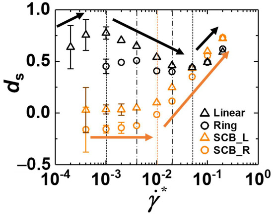 In contrast, both the SCB linear and SCB ring polymers exhibit nearly constant behavior for with respect to the shear rate throughout the weak and intermediate flow regimes. As mentioned previously, the highly mobile short branches make the overall chain structure more compact and less deformed (with highly curvy backbone structures) against the applied flow [25]. This structural feature entails smaller entanglement interactions between chains and less variation in the degree of entanglement with respect to the flow strength, ultimately weakening the degree of the out-of-plane wagging and disentanglement mechanisms and consequently affording the apparent constant behavior of for the SCB polymers.