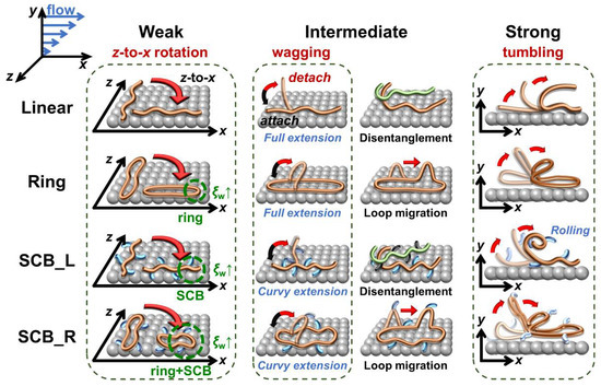 Figure 2 depicts the characteristic molecular mechanisms for each polymer system in the three representative (weak, intermediate, and strong) flow regimes. To systematically understand the influence of the ring and short-chain branches on the interfacial chain dynamics, we illustrate the mechanisms of the linear polymer as basis.