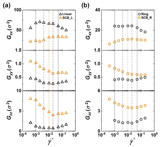 In contrast, the SCB linear and ring polymers exhibit increasing behavior of and decreasing behavior of and throughout the weak-to-intermediate flow regimes, with all components remaining almost constant in the strong flow regime. Furthermore, the SCB polymers display a significant reduction in Gxx and increase in Gyy and Gzz in comparison to the corresponding pure linear and ring polymers. This feature is directly associated with the fact that the structural disturbance by the fast random motions of the short branches results in highly curvy backbone structures and lesser degrees of chain stretch and alignment to the flow direction for the SCB polymers.