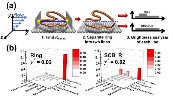 To investigate the distinctive structural characteristics of the interfacial SCB ring polymer, we conducted the Brightness analysis to categorize the mesoscale chain structures into several representative configurational classes (namely, stretched, coil, dumbbell, kink, half-dumbbell, and fold) on the basis of the monomer distribution along the chain [40,41]. For this analysis, we devised a new scheme that provides detailed structural information for interfacial ring-shaped polymer chains. Specifically, (i) we first identify the longest dimension () of the ring backbone in the flow direction, (ii) we then divide the ring backbone into two linear parts separated by the cutting line of , and (iii) we finally perform the Brightness analysis for each part separately and categorize the respective molecular configurations into the six representative classes, as depicted in Figure 5a.