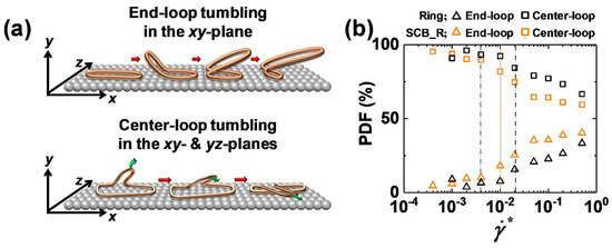 (a) Schematic depiction of the two types of loop tumbling mechanisms (end-loop tumbling and center-loop tumbling) of the interfacial ring chains. (b) Proportion of end-loop tumbling (triangles) and center-loop tumbling (squares) of the interfacial chains as a function of the shear rate for the pure ring (black symbols) and SCB ring (orange symbols) polymers. The vertical lines have the same meaning as in Figure 1.