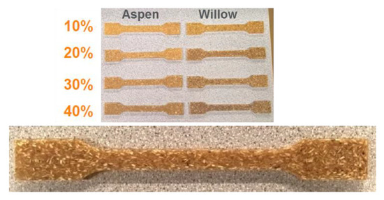Dog-bone shaped biocomposite test samples of aspen and willow.