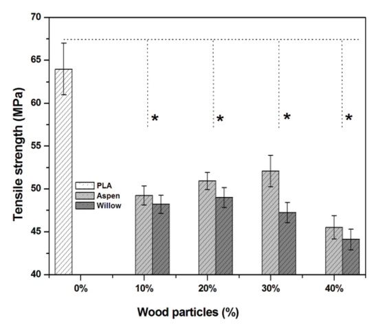 To evaluate the effect of reinforcement by wood particles on the PLA matrix, the mechanical properties of biocomposites were determined. The tensile strength of PLA was 64 ± 3 MPa. The addition of 10% of wood particles significantly reduced the tensile strength by 26% to 49 ± 2 MPa, as shown in Figure 3. This might be due to the random distribution of wood particles in biopolymer matrix, which has created different load transfer points within biocomposite due to packing frication. Tensile strength increased with further increase in wood particle content up to 30. However, increasing the wood particles content beyond 30% was found to have a negative impact on bond formation between polymer matrix and wood particles, thus creating weak interfacial regions [31]. Earlier studies also showed similar behavior in the reduction of tensile strength of wood particles (flour and fibers) reinforced PLA-based biocomposites with increasing wood content [32,33,34].