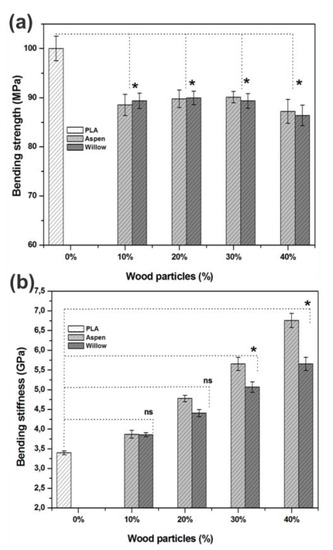 Comparison of the bending properties between the PLA and biocomposite samples: (a) Bending strength and (b) Bending stiffness. (* significant difference at p < 0.05 and ns not significant).