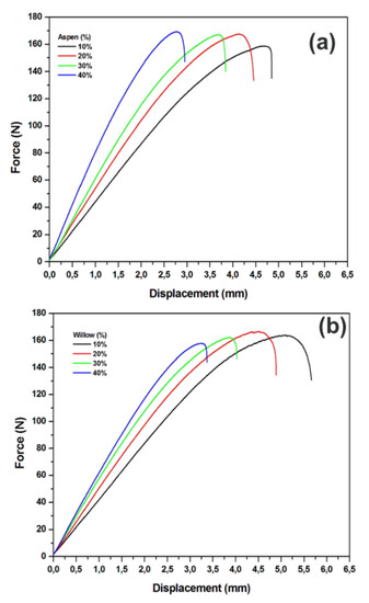 Load-displacement curves of biocomposites for bending strength for (a) aspen wood particles and (b) willow wood particles.