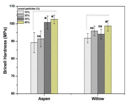 Brinell hardness of biocomposite with different weight percentages of wood particles. (* significant difference at p < 0.05 and ns not significant)