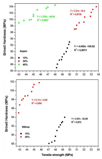 Hardness is of persistent interest to understand the relationships between hardness and other fundamental properties of material [36]. In the present work, the ultimate tensile strength of biocomposite was estimated with different wood particle content of two different wood species. The relationship between the Brinell hardness and the tensile strength of the biocomposite was determined by linear regression analysis and the coefficient of correlation was established between them, as shown in Figure 7. The linear correlation showed a decreasing trend with increasing wood particles content. The highest coefficient correlation R2 found was 0.987 for 10% aspen wood particles biocomposite, whereas 10% willow particles filled biocomposite showed R2 of 0.972. With 40% wood particles content, the R2 was reduced to 0.958 and 0.954 for aspen- and willow-based biocomposites, respectively. A similar value of correlation coefficient was reported [30] for wood plastic composite (polypropylene beech and pine wood mixed wood flour) between the Brinell hardness and tensile strength, where R2 significantly reduced when wood flour content of ≥40% was used for polypropylene-based injection molded composite. The interfacial bonding between biopolymer and wood particles might be reduced with increasing wood content, also possibly resulting in lower R2. According to literature, this is a typical behavior of thermoplastic composites that are filled with lignocellulosic material [16,18,31,35,37].