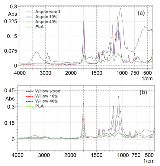 The biocomposite that was reinforced with aspen and willow wood particles showed the characteristic FTIR peaks (see Figure 9) of biopolymer and aspen wood, as discussed above. The O–H stretch (hydrogen-bonded) at 3350 cm−1 of wood was not presented in biocomposite, due to bonding between biopolymer and reactive hydroxyl group of wood. The C–O at 2995 cm−1, –CH3 asymmetric at 2946 cm−1 has shifted to 2926 cm−1, 2854 cm−1, respectively, when 40% of aspen wood particles reinforced the biopolymer matrix. The peak stretch intensity at 1746 cm−1 that represented the C=O stretch of wood and –CH3 symmetric of biopolymer significantly increased for biocomposites with increasing wood content.
