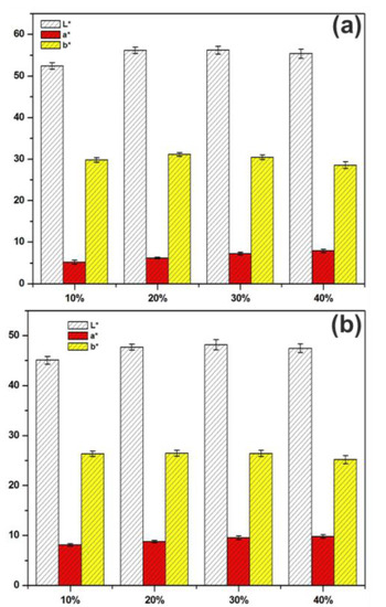 Color measurement of biocomposites with different weight percentage of aspen (a) and willow (b) wood particles.