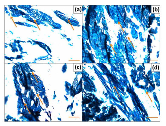 Figure 10 shows the visual appearance of microstructure of biocomposites with different wood particles content of aspen and willow mixed with the PLA matrix. The wood particles were uniformly mixed with the binder and cellular characteristics of wood were well recognizable. The interfacial bonding of wood particles with the biopolymer was homogenous, which resulted in even and high quality of the composite material. It was clear from microstructures that the wood particles were covered by the polymer matrix that could account for good strength performance of biocomposites. Any types of bubbles or voids were not observed between the biopolymer matrix and the wood particles; however, with higher wood particles content, the homogeneity decreased, possibly causing negative impacts on mechanical properties. The arrows in Figure 10 represent the interfacial zone formation between wood particles and PLA materials. At low wood content, the wood particles formed a bigger interface and random distribution with PLA matrix (Figure 10a,c), and wood particles seem to appear ruptured. On the other hand, the high wood content loading into PLA matrix formed smaller interface zone and wood particles appeared to be less ruptured. The higher wood content loading showed lower tensile strength due to the formation of smaller interface zone.