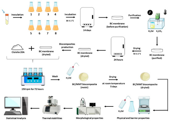 Complete methodology used for BC and BC-MMT biocomposite production and characterization.
