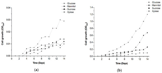 Due to its unique properties, BC has drawn attention from industries exploring novel strategies for improving BC production. Unfortunately, large-scale production and industrialization of BC are limited due to the low-cost effectiveness of cultivation in traditional synthetic media and static cultures. As a result, numerous efforts have been made to develop new methods for BC production. As described in different studies, BC production can be greatly influenced by a range of variants, such as bacterial strain, reactor type, pH, temperature, aerobic conditions, and nutrient concentration in the culture media [39,40,47,48,49,50]. Among these nutrients, the influence of the carbon sources has been the object of continuous studies [49,50]. The present study highlights the ability of G. hansenii ATCC 23769 to metabolize several carbon sources in modified HS media and the effects on cellulose production. The bacteria were incubated for 14 days, which is the time until the first BC production was observed, and cellulose was extracted to examine the yields. Figure 2 shows the bacterial growth over time.