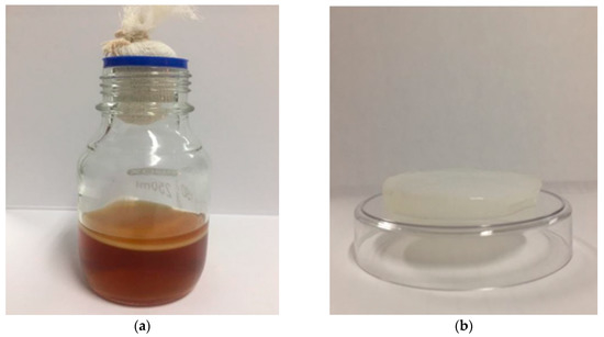 BC produced by G. hansenii: (a) BC produced in glucose-containing media after a 14-day incubation period; (b) pure BC membrane after purification process.