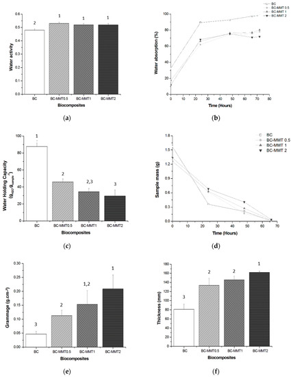 Physical and barrier properties: (a) Water activity (aw) content; (b) Water absorption; (c) Water holding capacity (WHC); (d) Water release test (WRR); (e) Grammage; and (f) Thickness of pure BC and BC-MMT biocomposites. No significant difference between values with the same superscript numbers (1, 2, 3) in a bar (p > 0.05), according to Tukey’s test with 95% confidence.
