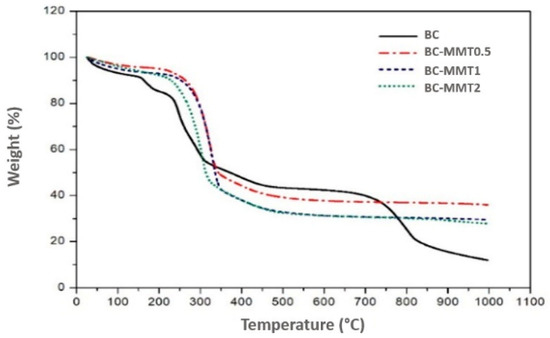 TGA is a thermal analysis method in which the mass variation of the sample (loss or gain) is determined as a function of temperature and/or time. TGA allows for monitoring the occurrence of various reactions, such as dehydration, oxidation, and degradation. Figure 5 shows the TGA curves (25–1000 °C) of the pure BC and BC-MMT composites. The graphs show two major weight loss zones. Approximately 9% of the mass loss of the pure BC occurs in temperatures between 80 and 120 °C. This finding is in contrast to the BC-MMT materials that presented a mass reduction of only 5%. The weight loss occurring at 80–120 °C is due to the loss of moisture content and interlayer coordinated water molecules [82]. The relatively higher weight loss for the pure BC at this temperature range may be due to its higher WHC compared with the BC–MMT composites as shown in Table 5. In the second phase, degradation of the main cellulose skeleton is initiated at 225 °C in all samples [82]. The maximum weight loss was recorded for all samples during this phase. The weight loss for the pure BC is approximately 45% during this phase (Figure 5). In this phase, the weight of all the BC-MMT composites was lower than that for pure BC. Additionally, with the increased concentration of MMT, the weight loss decreased by approximately 48, 51 and 53% for BC–MMT0.5, BC–MMT1, and BC–MMT2, respectively. Additionally, Figure 5 shows a difference between the degradation of pure BC and BC-MMT composites along this phase. The first difference is noted at 151 °C and was extended to 177 °C for all the formulations.
