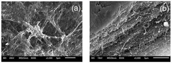 Figure 6 shows the SEM images of pure BC and BC-MMT biocomposites. Figure 6a presents a proper fibrous structure of the cellulose produced by G. hansenii and its high porosity [59]. The alkaline treatment performed for BC purification influenced in the porous membrane as evidenced by Sulaeva et al. [8]. The membrane sagittal cut (Figure 6b) presents a porous network interconnected via lamellar formation. Porosity is a characteristic that directly influences the adhesion and cellular growth in the dressing material matrix [83].