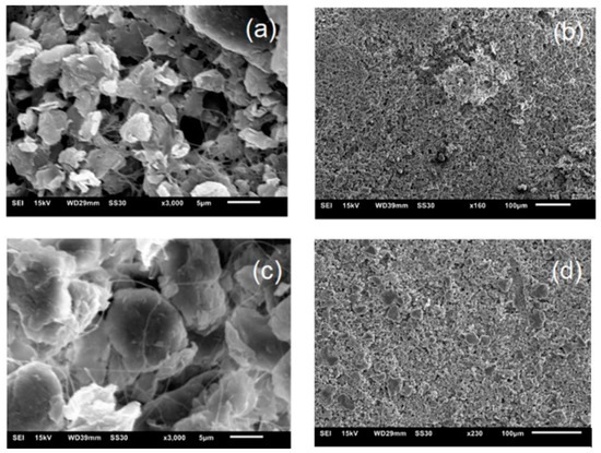 Scanning electron microscopy (SEM) micrographs of the surface and cross section morphology of: (a) ×3000 and (b) ×160 BC-MMT0.5; (c) ×3000 and (d) ×230 BC–MMT2.
