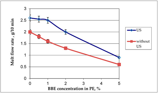 Processing of ultrasonic melts leads to the increase in the MFR of pure polyethylene and compositions with BBE. The increase in the MFR value under the influence of the ultrasonic treatment is associated with the peculiarities of the effect of the ultrasonic treatment on polymer melts, as presented in [25]. The increase in the content of BBE in the composition of PE leads to the decrease in the MFR, this is due to the fact that the BBE introduced into the polymer behaves as the “filler-polymer”.