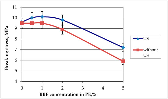 The influence of the BBE concentration and ultrasound treatment on the physico-mechanical properties was evaluated by two indicators: breaking stress and elongation at break. The results are presented in Figure 5 and Figure 6.
