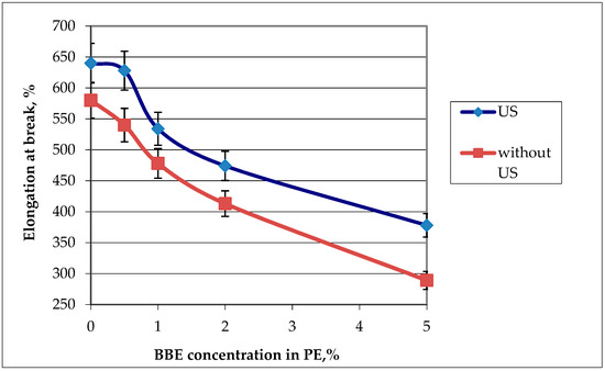 Graphic dependence of the elongation at break on the birch bark extract (BBE) content in polyethylene (PE) and on ultrasonic (US) treatment.