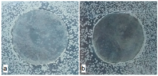 External appearance of polyethylene without birch bark extract (a) and polyethylene with 1.0% content of birch bark extract (b) and the use of ultrasonic treatment after the incubation under the influence of C. albicans for 24 h.