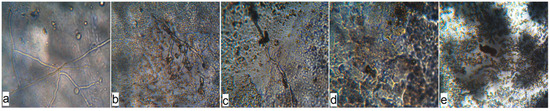 Microphotographs of the surface of the inoculated polyethylene materials with birch bark extract and with the use of ultrasonic treatment on the 14th day of A. niger exposure (100× magnification): (a) PE 0% BBE ultrasound; (b) PE 0.5% BBE, ultrasound; (c) PE 1.0% BBE, ultrasound; (d) PE 2.0% BBE, ultrasound; (e) PE 5.0% BBE, ultrasound.
