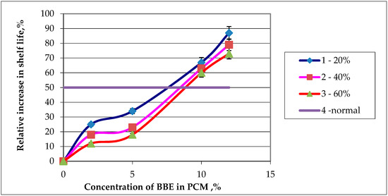 Dependence of the relative increase in shelf life of the food product on the contents of birch bark extract (BBE) in composition material (PCM): (1—content of thermoplastic starch 20% in PCM; 2—content of thermoplastic starch 30% in PCM; 3—content of thermoplastic starch 60% in PCM; 4—desired value to increase product storage).