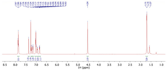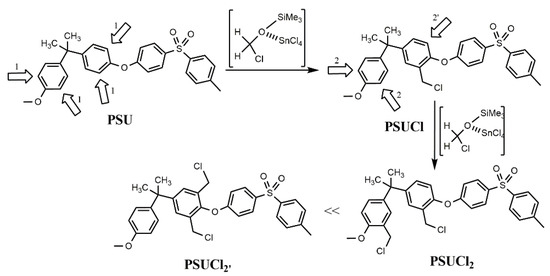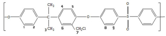 The method A allowed to obtain derived PSUs with a degree of chloromethylation less than 70%, minimizing the use of harmful reagents and reducing costs. The method B, which is used for the synthesis of derived PSUs with a chloromethylation degree higher than 70%, requires a larger amount of reagents, and in this way it was possible to obtain PSUs with up to 150% functionalization (Table 1). All products were analyzed by 1H-NMR using CDCl3 as a solvent.