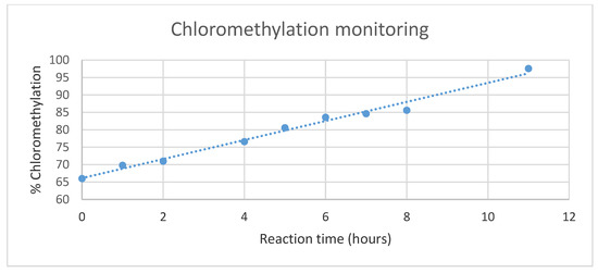 The curve-fitting allowed us to visualize and plot the curve that best describes the shape and behavior of percentage of chloromethylation as a function of time (Figure 3). The best fitting was found with a linear regression. Below is the function used: y = 2.7354x + 66.12 R2 = 0.9852.